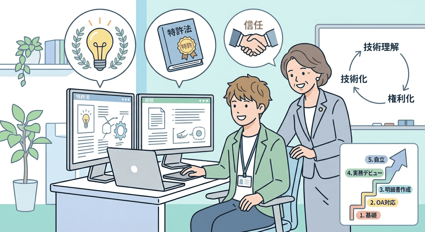 いきなり「明細書を書いてみて」と丸投げされることはありません。まずは特許法の基礎座学から始まり、過去の事例を使った演習、そして簡単な案件の補助へとステップアップしていく流れが明確です。
